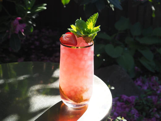 Combine everything into a tall glass, give it a quick stir and fill with pebble ice. Slap the mint leaves in your hand and tuck the sprigs into the top of the glass, and float the strawberry on top of the ice. Enjoy!
