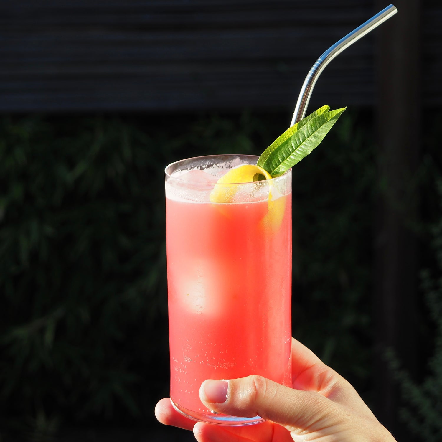 Muddle lemon verbena with citrus juice, then add everything else and stir, then add ice and garnish. (No lemon verbena on hand? Try using another fresh herb such as mint, tarragon, or basil!)
